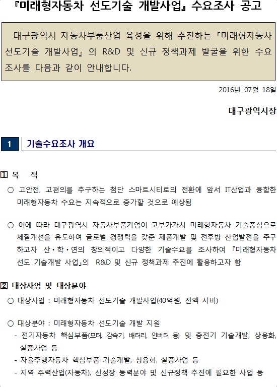 [±â¼ú¼ö¿äÁ¶»ç Á¢¼ö°ø°í] ¹Ì·¡ÇüÀÚµ¿Â÷ ¼±µµ±â¼ú °³¹ß»ç¾÷ ±â¼ú¼ö¿äÁ¶»ç °ø°í