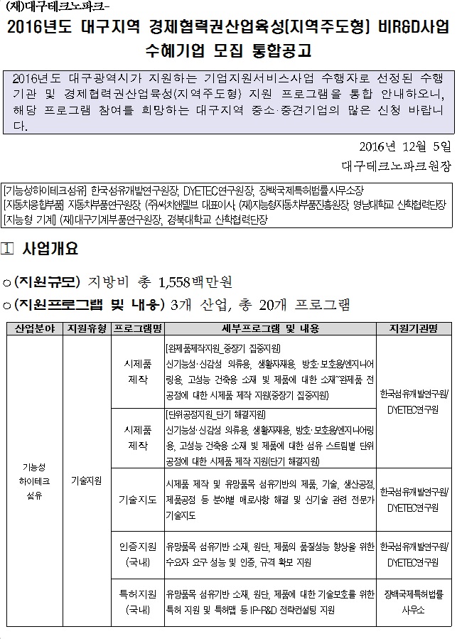 [¼ö¿ä±â¾÷ ¸ðÁý°ø°í] 2016³âµµ ´ë±¸Áö¿ª °æÁ¦Çù·Â±Ç»ê¾÷À°¼º(Áö¿ªÁÖµµÇü) ºñR&D»ç¾÷ ¼öÇý±â¾÷ ¸ðÁý ÅëÇÕ°ø°í