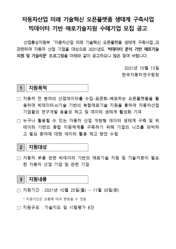 [¼öÇý±â¾÷ ¸ðÁý°ø°í] ÀÚµ¿Â÷»ê¾÷ ¹Ì·¡ ±â¼úÇõ½Å ¿ÀÇÂÇ÷§Æû »ýÅÂ°è ±¸Ãà»ç¾÷ ºòµ¥ÀÌÅÍ ±â¹Ý ¾Ö·Î±â¼úÁö¿ø ¼öÇý±â¾÷ ¸ðÁý°ø°í
