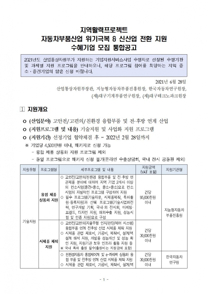 [ºñR&D] 2021³â Áö¿ªÈ°·ÂÇÁ·ÎÁ§Æ®¡¸ÀÚµ¿Â÷ºÎǰ»ê¾÷ À§±â±Øº¹ & ½Å»ê¾÷ Àüȯ Áö¿ø¡¹¼öÇý±â¾÷ ¸ðÁý 1Â÷ ÅëÇÕ°ø°í